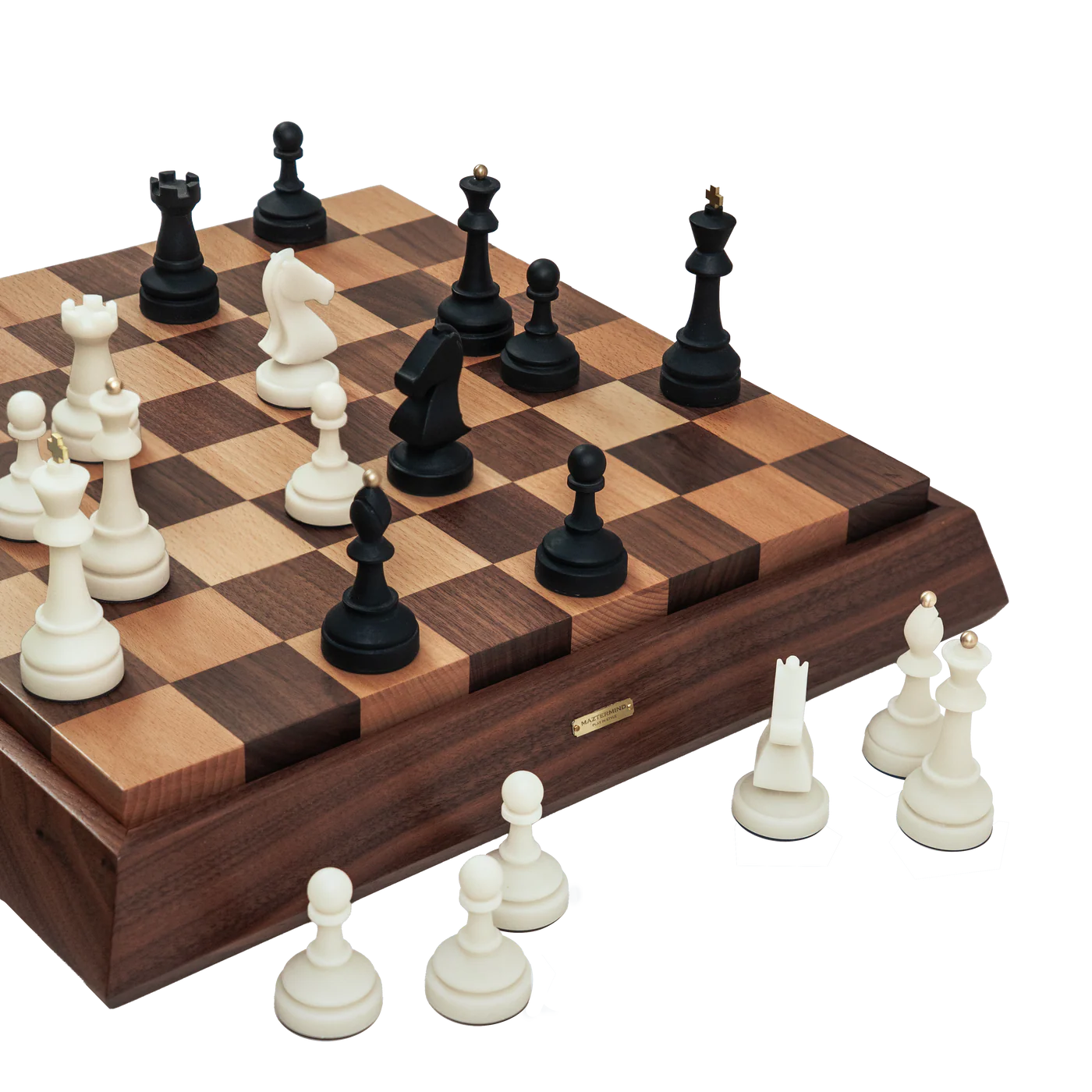 The chessboard is crafted from premium Walnut and Beechwood, featuring elegant natural wood grains. Each square is assembled from alternating light and dark wood tones, creating a visually striking effect. The set includes 32 chess pieces cast from high-quality resin, meticulously finished down to the finest detail.