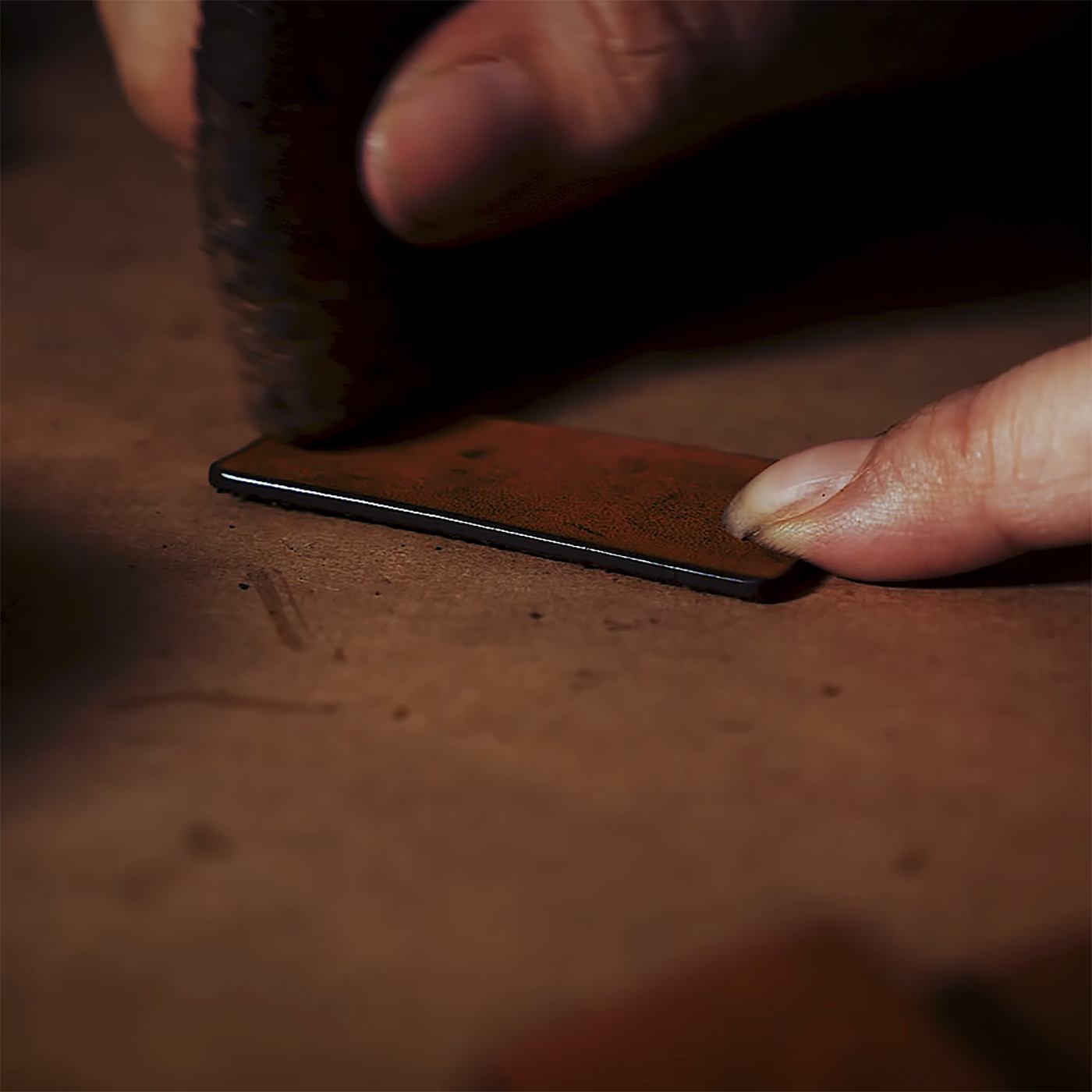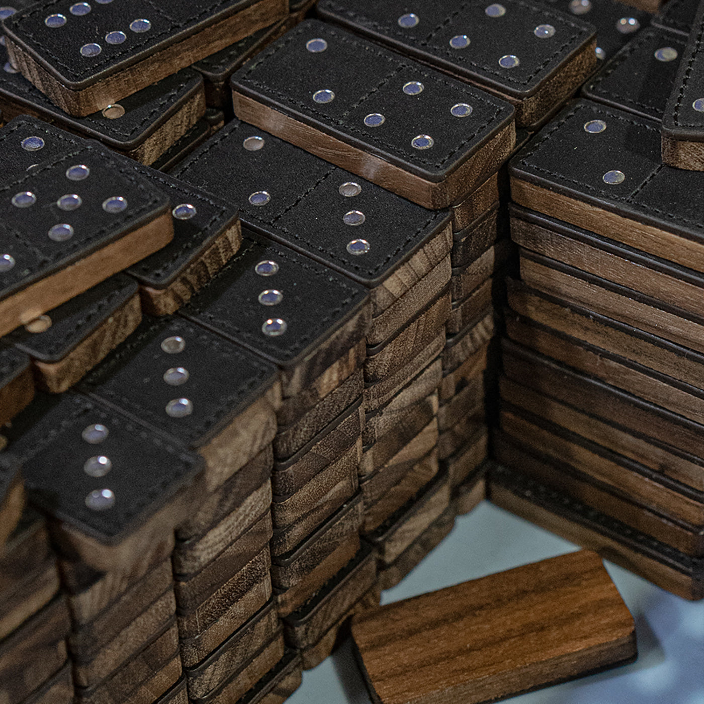 Edge finishing: To create the polished, smooth, and durable edge for our leather product (Leather Dominoes Set, and Dice Shaker Cup), each piece goes through 4 steps of edge finishing, including cutting leather with knives, sanding, burnishing, and edge painting.