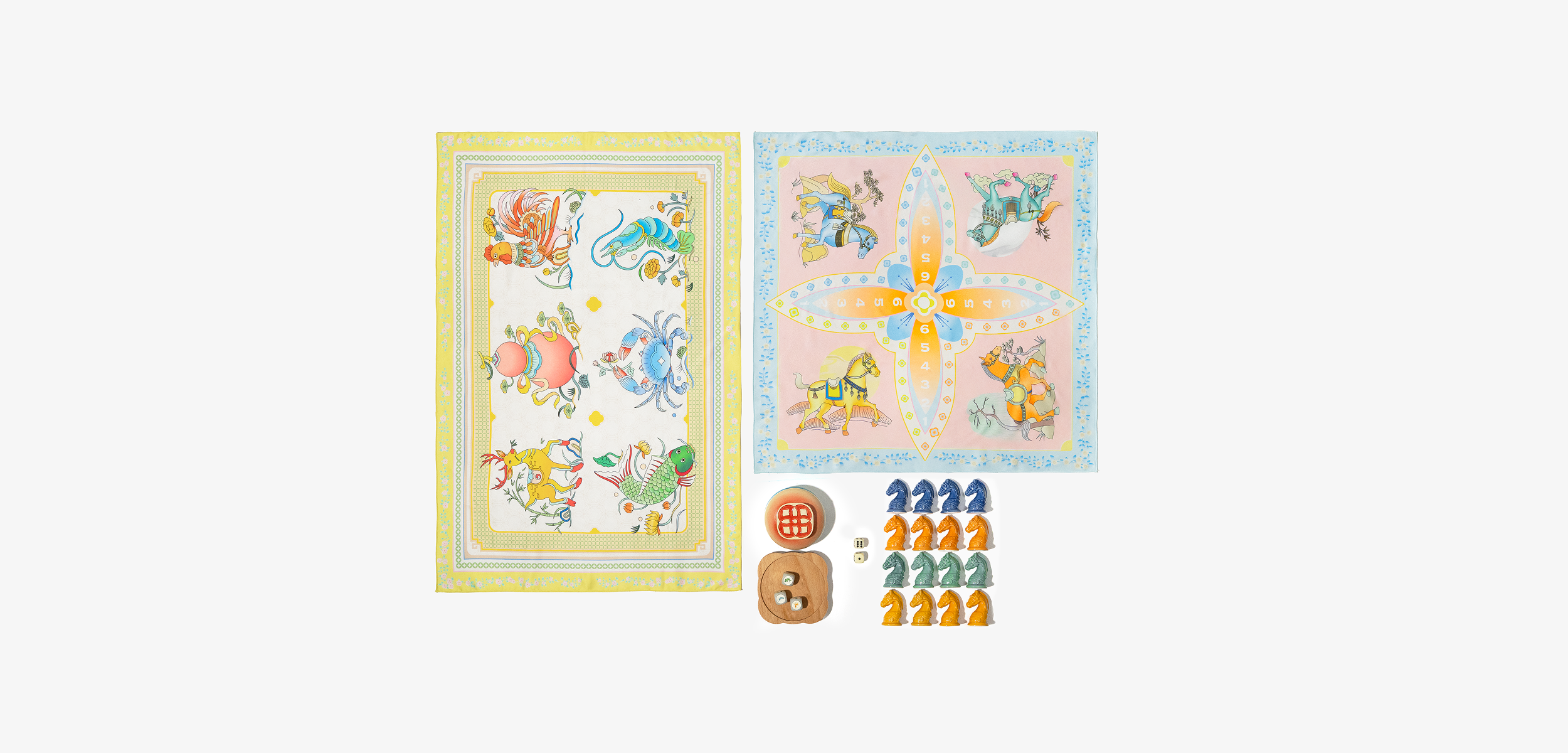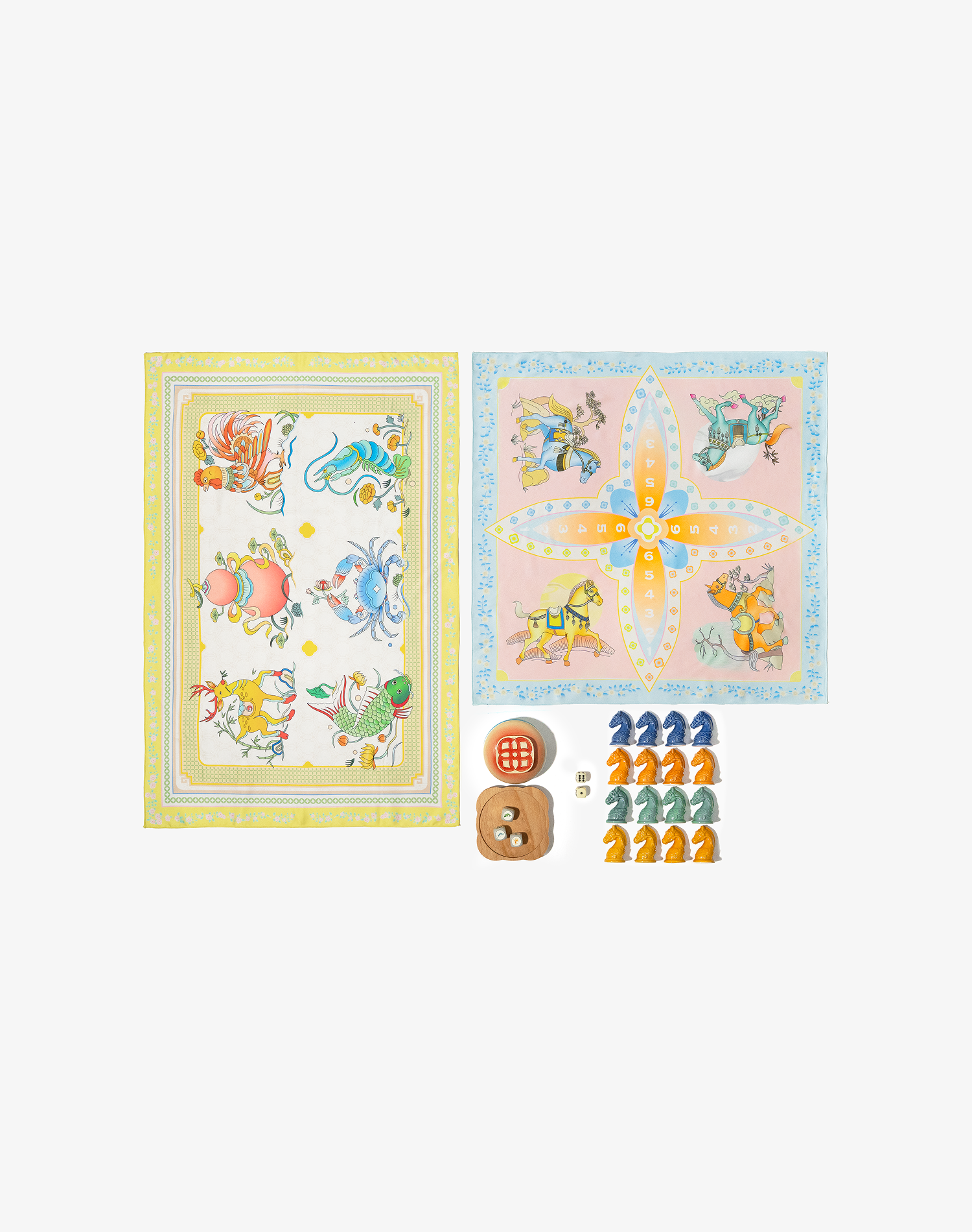 The 2-in-1 Bau Cua Ca Ngua (Hoo Hey How - Ludo) Set brings together two traditional Vietnamese games on a soft satin surface, refined through a clean, elegant, and contemporary design.