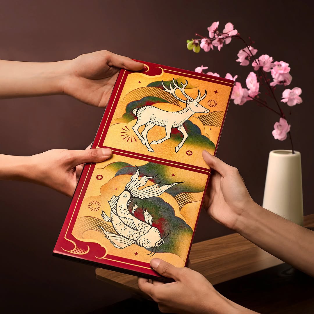 Inspired by the bold strokes and signature red and blue colors of Đông Hồ folk painting, Bầu Cua Ý Giao skillfully blends traditional charm with a modern twist. Lotus, chrysanthemum, pine, bamboo, and peony motifs evoke the fresh, festive atmosphere of Tet, carrying the rich values of Vietnamese New Year and bringing warmth and joy to every gathering.