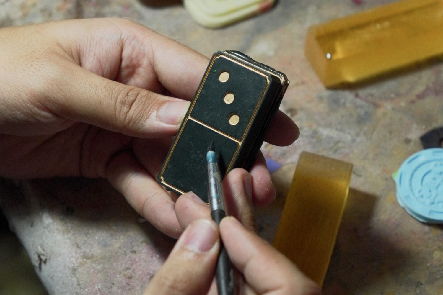 On the wooden box, the shimmering golden lotus motifs evokes a feeling of purity and tranquility, while butterflies and dragonflies appear on special domino pieces as symbols of transformation and peace. The flowing curves and natural motifs not only highlight the aesthetic value but also recall the spirit of traditional craftsmanship, turning a familiar game into an artistic experience deeply connected to cultural memory.