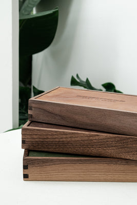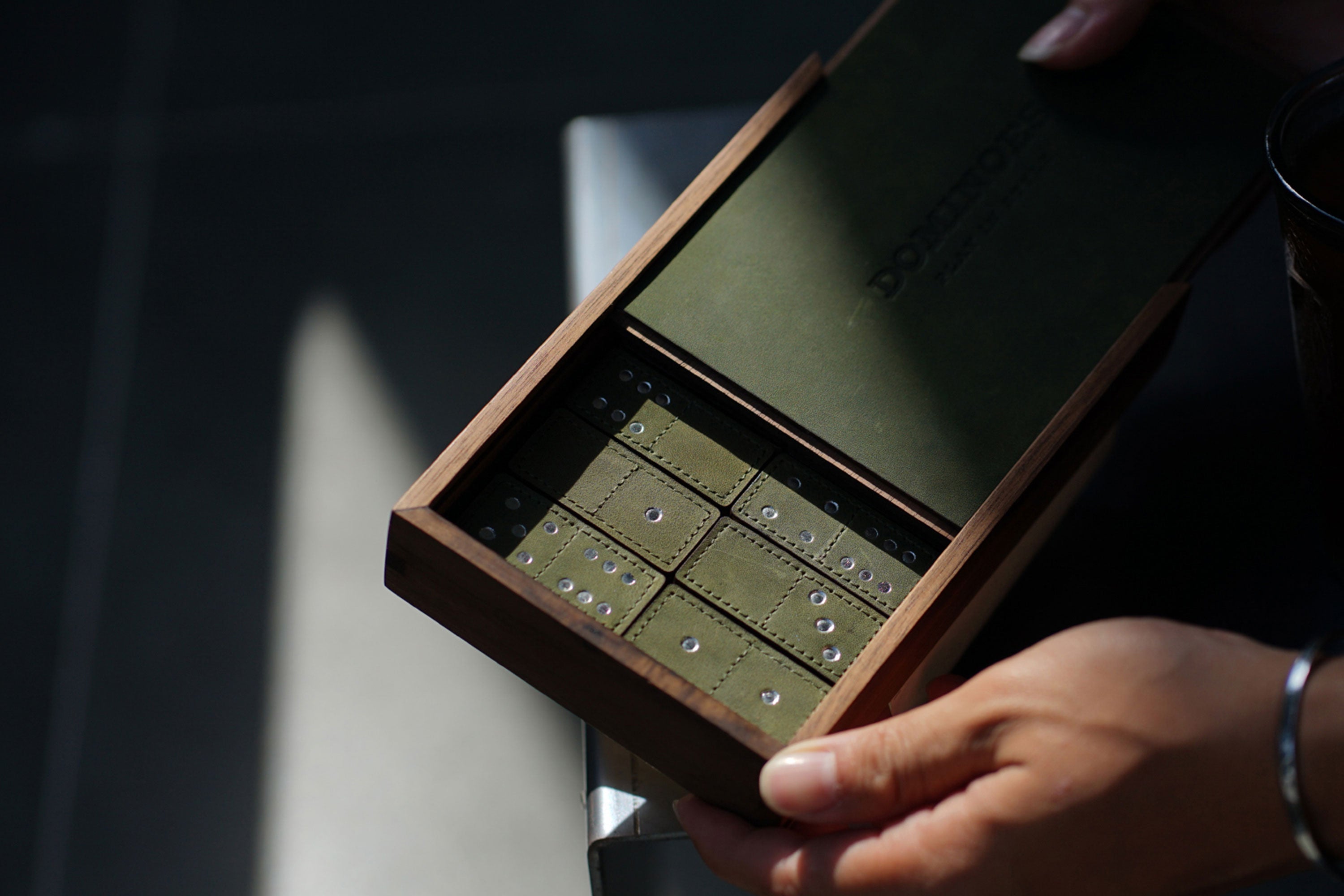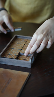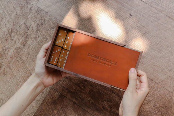 This is just a peek behind the curtain of the making of a Dominoes set. To give this classic game a fresh look, each stage demands artistry, originality, and diligence on the part of the craftsman. It requires the artisans to meticulously sand the walnut wood to add perfect smoothness to the playing experience. Walnut wood box with heat-stamping wax leather adds a luxurious appearance along with multiple wax skin colors options.