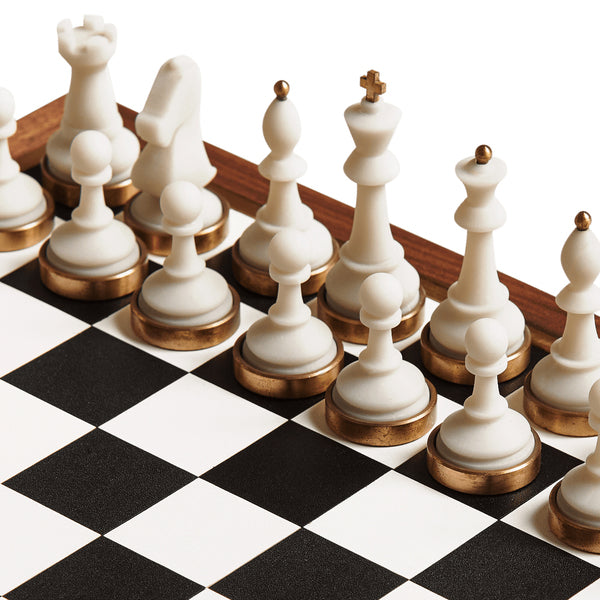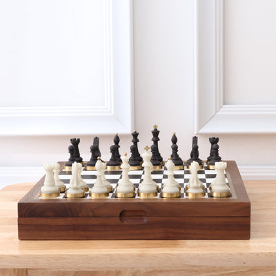 The highlight of Maztermind Premium Classic Chess piece lies in the conjunction of the material Resin and Concrete. This combination satisfies aesthetic requirements thanks to the rough surface of cement while enduring the test of impact and water. The sturdy pedestal from brass in every chess piece contributes to the overall elegance.The box is made of Walnut wood characterized by natural brown color and delicate wood grain.