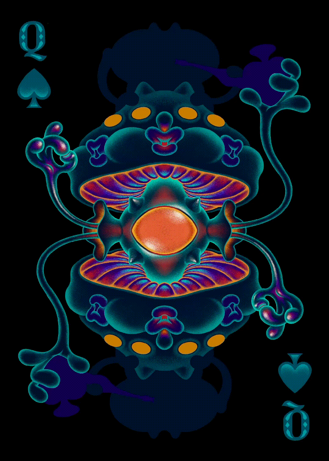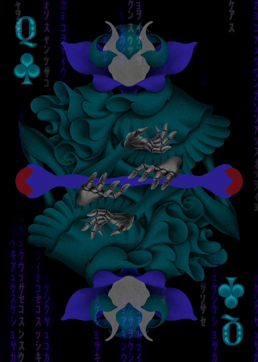 Embodying characteristics similar to those of plants and insects, the Clubs suit emerges with delicate patterns reminiscent of flora, intertwined with the rugged textures of insect life. Symbolizing the adaptability of nature, this suit captures the vigorous growth of alien ecosystems in outer space.