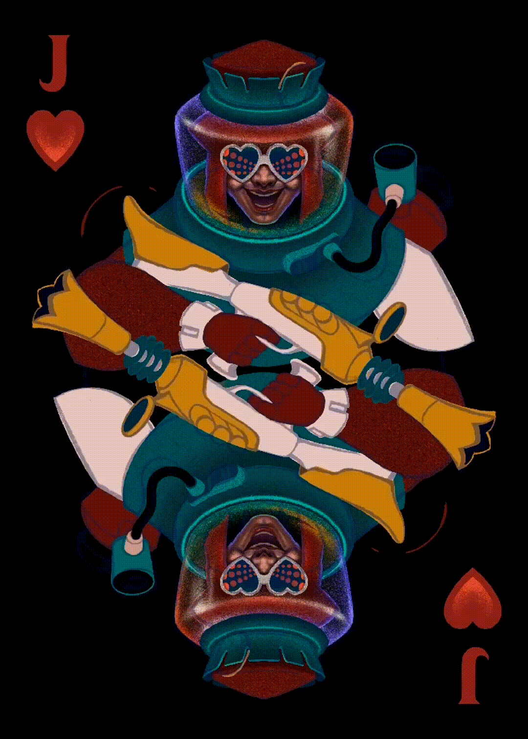 Inspired by the essence of humanity, the Hearts suit radiates the vibrant energy of Carnival festivities. Dressed in Space Age attire and donning astronaut helmets for journeys into the infinite cosmos, it shines with brilliant golden accents, embodying the human spirit of creativity, boundless enthusiasm, and an unrelenting quest for joy.