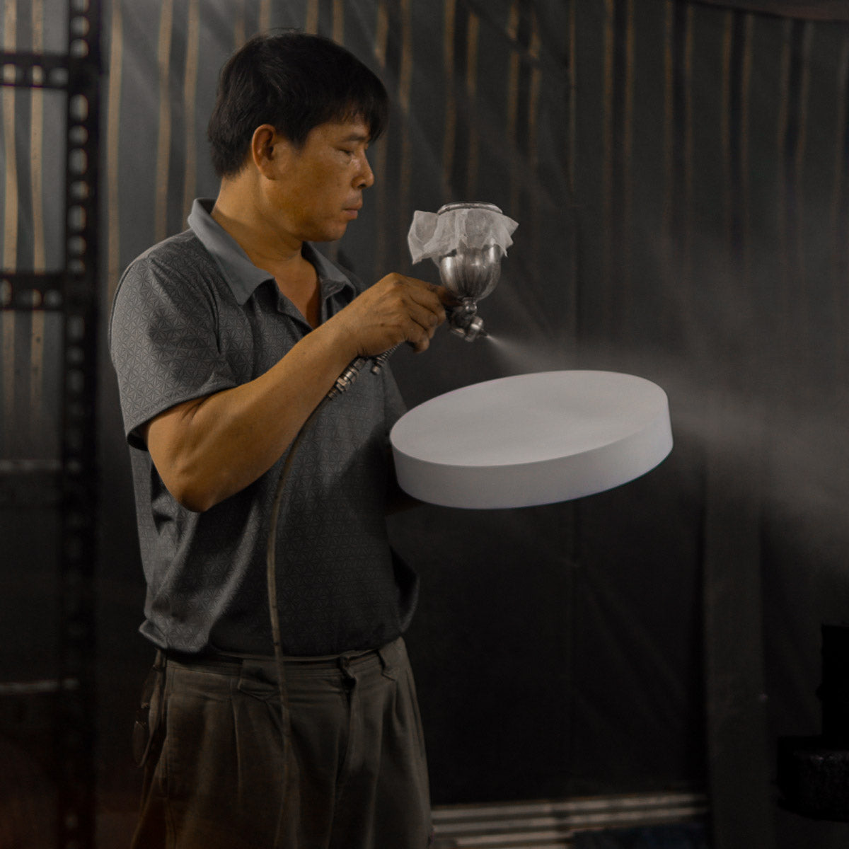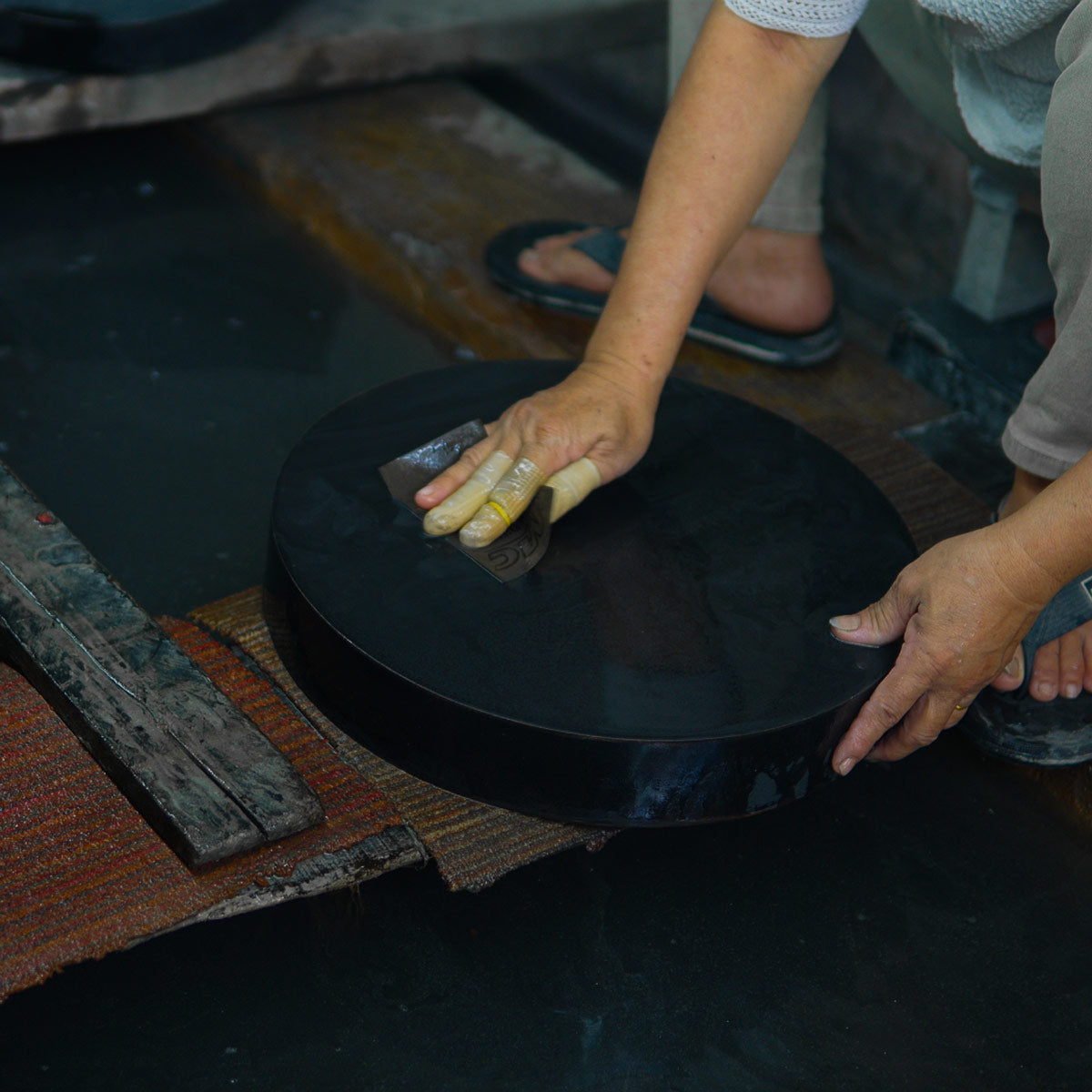 Once the surface is smoothly sanded, our artisans apply the first layer of base color primer and carefully inspect the wood base again. After confirming there are no additional flaws, the initial coating is lightly abraded to create a surface ready to grip the second base coat. Finally, when the wood base has fully absorbed the primer layers, the artisans apply the final color coat, imbuing the surface with a refined and subtle hue.