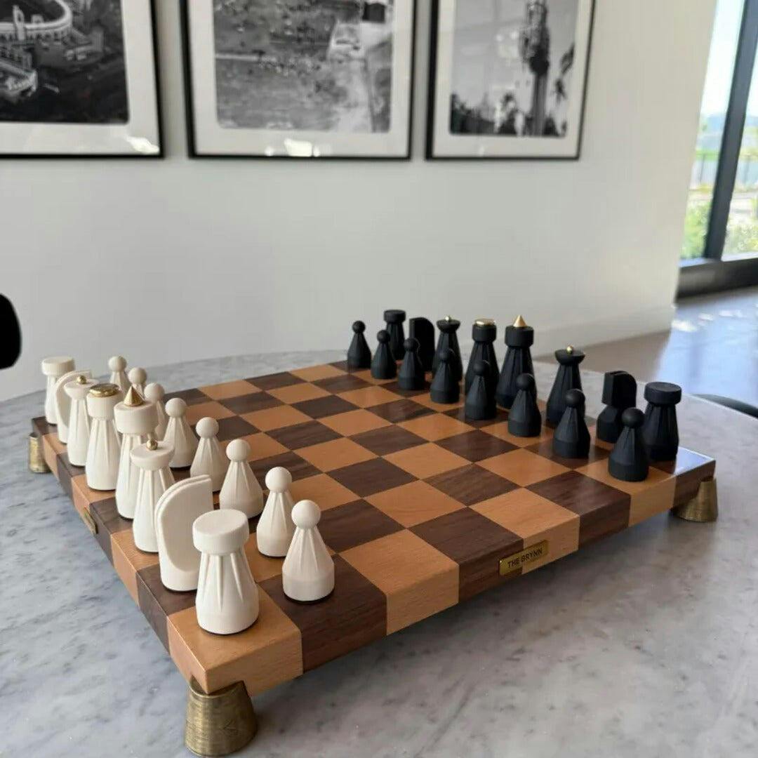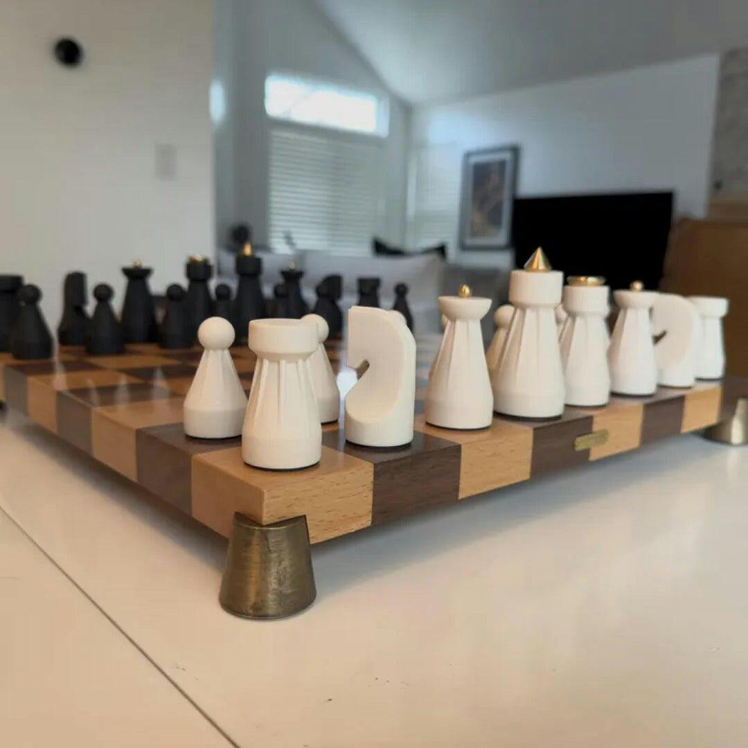 The rigorous material selection ensures perfect color uniformity of walnut and beech woods, creating a sophisticated chessboard where wooden square blocks are alternately glued together. Every edge is meticulously sanded to provide a smooth and safe gameplay experience. Four solid copper bases are fixed to the board's corners, not only enhancing the set's harmonious design but also turning it into a striking decorative statement in any living space.